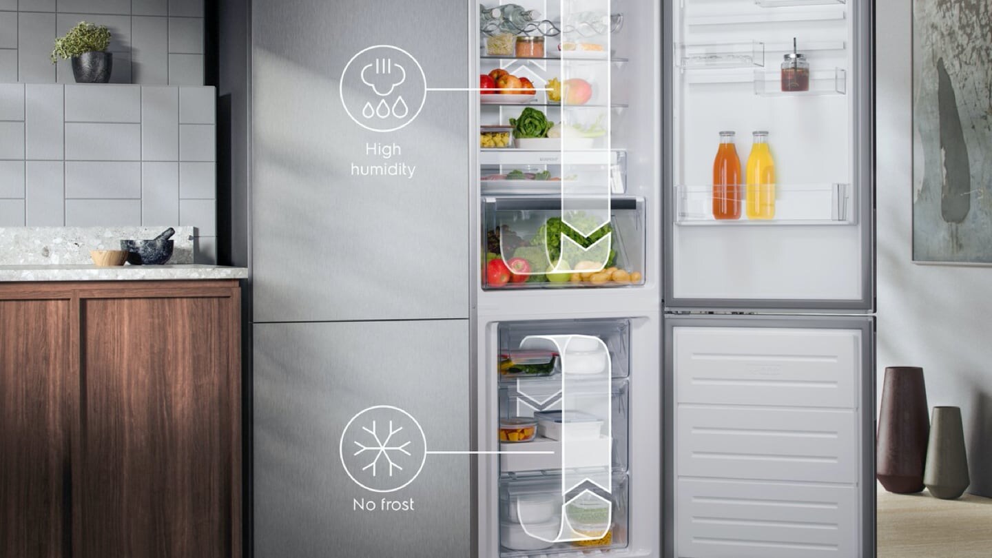 Electrolux frižideri pomažu usačuvanju vrednosti pohranjenih namirnica i do 95% vitamina. Zaštitite kvalitet hrane stabilnom temperaturom i vlažnosti u svakom ćošku frižidera. Unutrašnjost od pravoga nerđajućeg čelika odaje vrhunski kvalitet, ostavljajući dojam ekskluzivnosti. Višestruki efikasni ventilacijski otvori brzo vraćaju temperaturu na optimalnu nakon svakog otvaranja vrata, što pomaže u smanjenju količine otpada do 28%*.